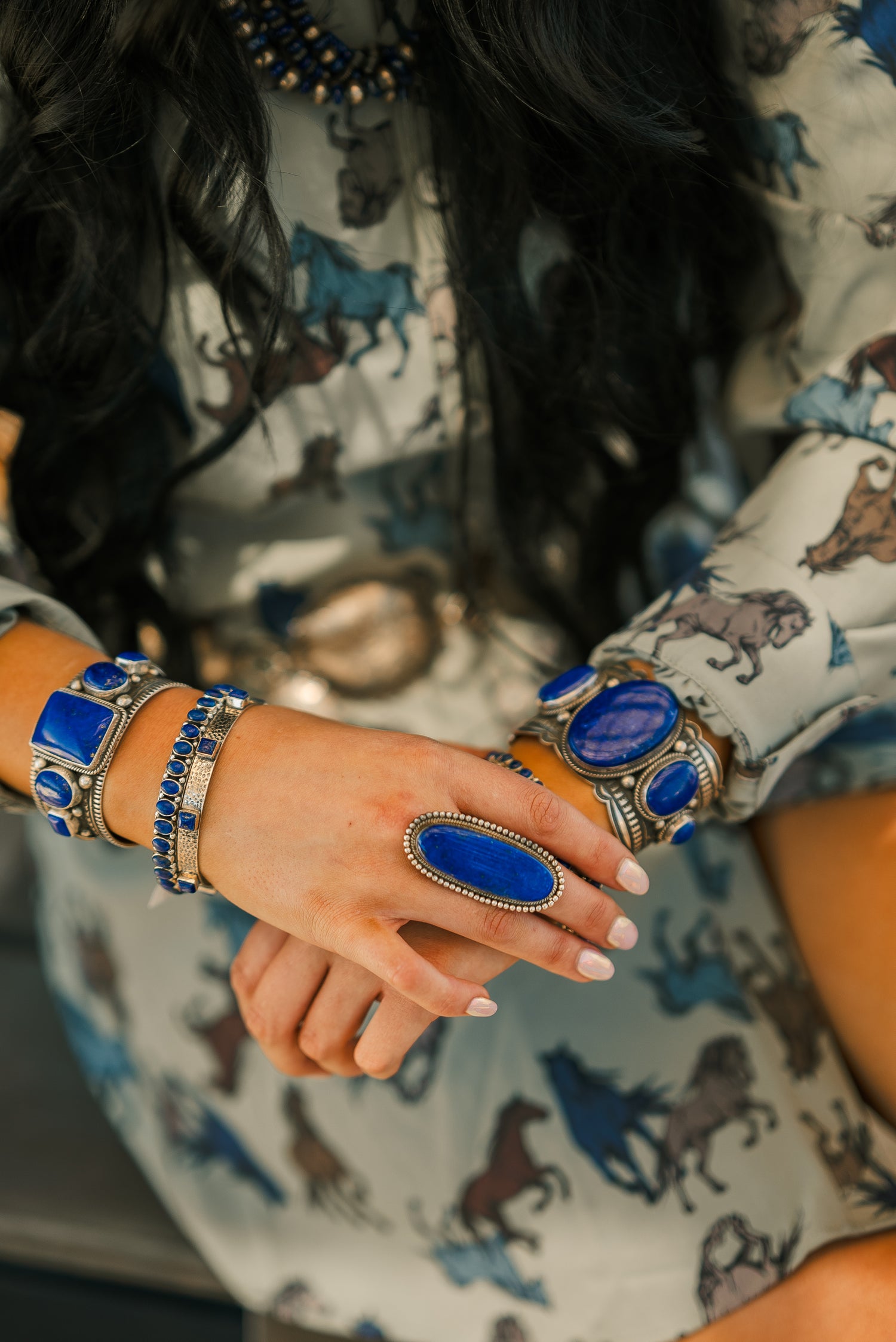 The Kayce Ring starts this collection out strong along with a few of our favorite Bangles. And no wrist stack is complete without a couple statement cuffs like the Andy Cadman and the Blue Lapis.