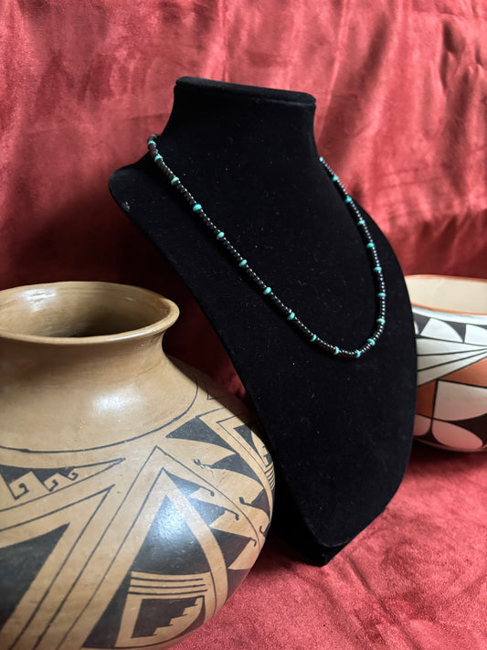 24" Carved Turquoise & Black Shell Heishi Necklace with Silver Accents