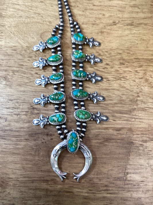 Squash Blossom, 27" Bench Made beads and blossoms, 3 cabs turquoise, unknown Native Artist circa 1965