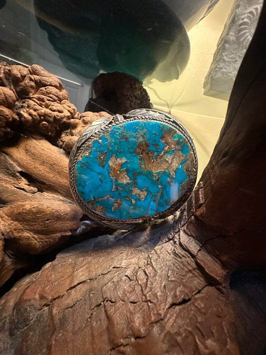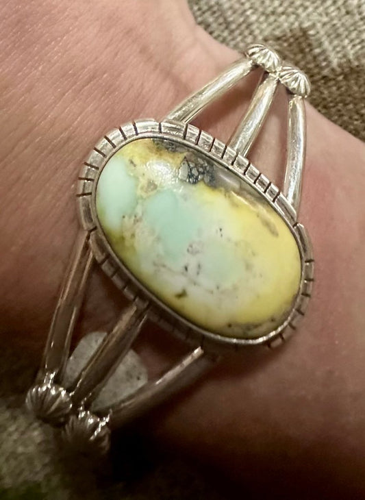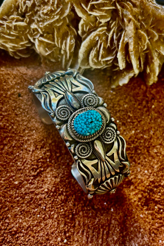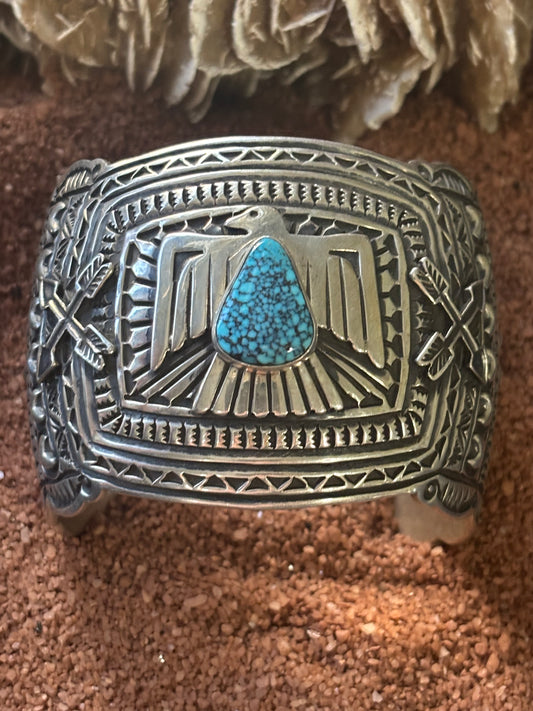 Wide Thunderbird Cuff w Spider Web Turquouse Center stone, by JO White