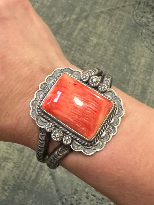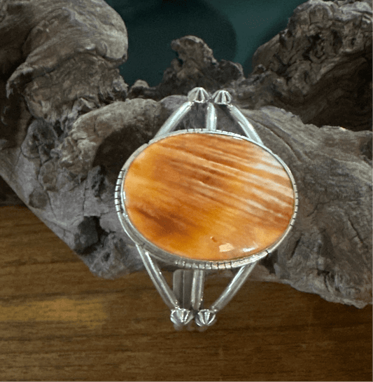 Dainty Sterling Silver Cuff with Large Oval Orange Spiny Oyster Centerpiece by Sam Etsitty