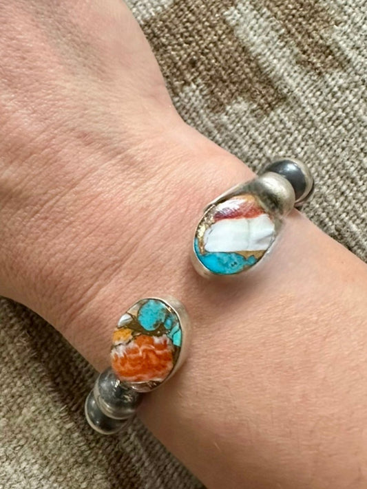 Our Multi-Stone Collection pairs natural gemstones for bold contrast and beautiful balance—think Turquoise + Onyx, Spiny Oyster + White Buffalo, Turquoise + Lapis, and more. Each piece is crafted in solid sterling silver with hand-set stones arranged in classic clusters, elegant rows, floral bursts, or clean modern settings. The result: color stories with depth, movement, and unmistakable Western elegance.