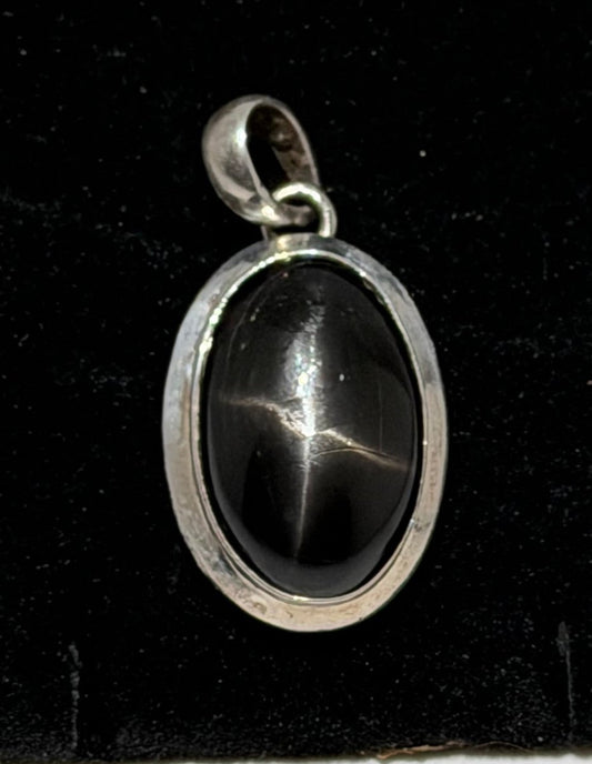Black Star Sapphire Oval Pendant, 1.75” long, beveled bezel,