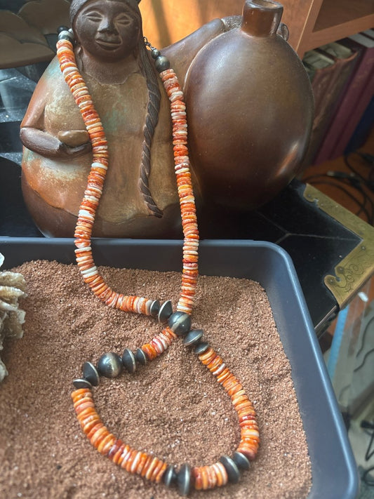 Necklace, 25" x 10mm premium Orange spiny oyster heishi, 10-14mm saucer pearls and 14mm riynd pearls, TM