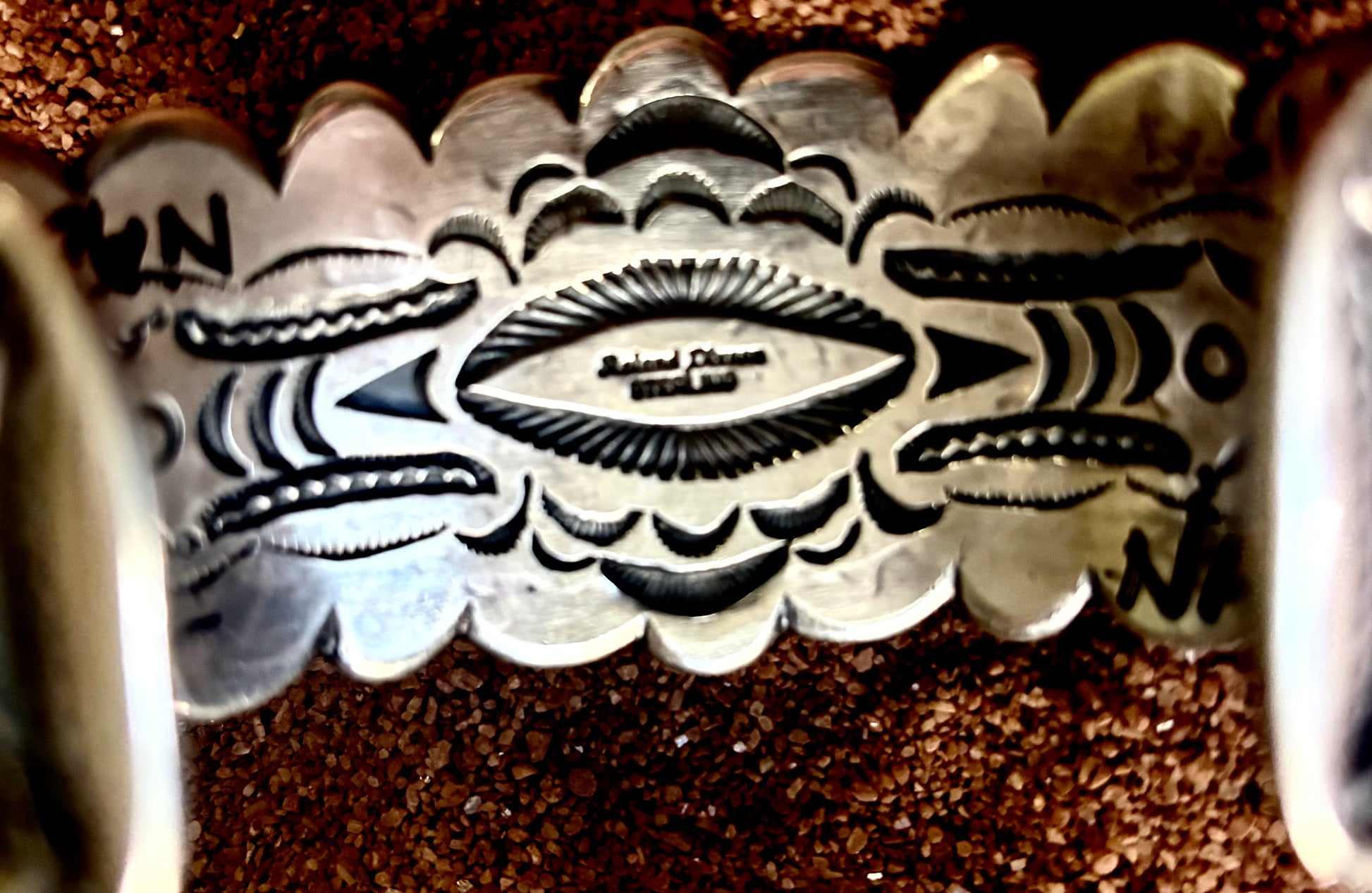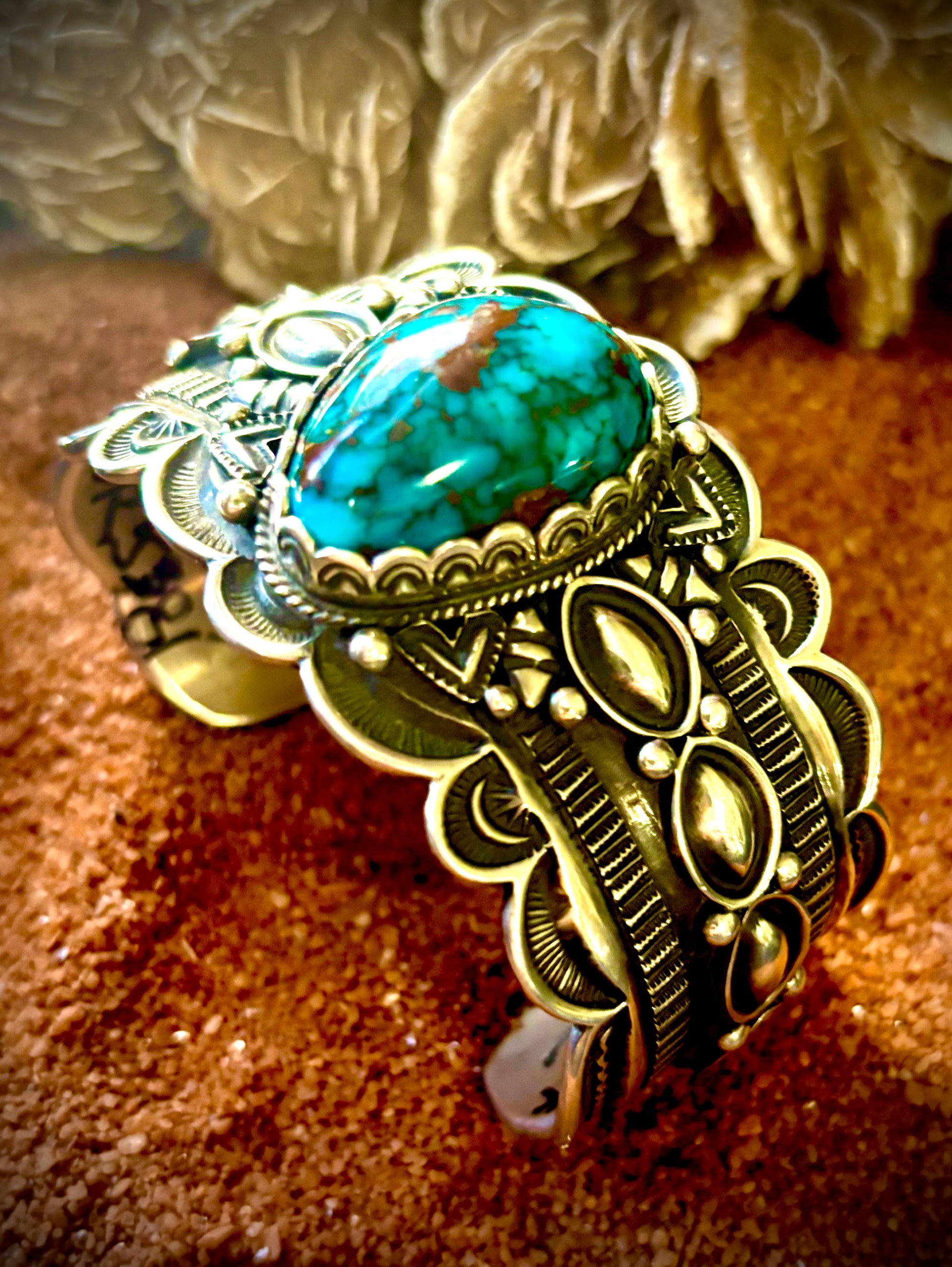 Blue center stone, unique stamp work done with Rolands hand-forged stamps, repoussee overlay details and, rope and raidrop accents. A stunning collector's piece by a well known artist.
