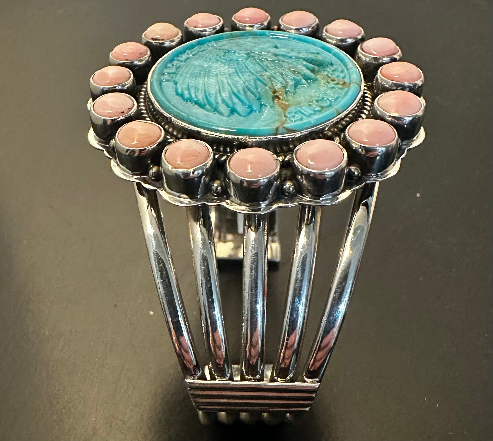 Carved Turquoise Native American Cameo Chieftain Head Five Wire Sterling Silver Cuff with Pink Conch Cabachon Halo