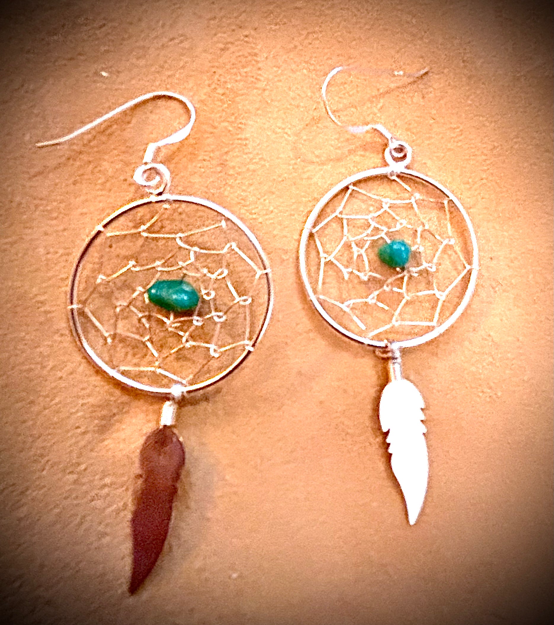 Earring, Dreamcatcher w/ Single turquoise beads & feather dangle