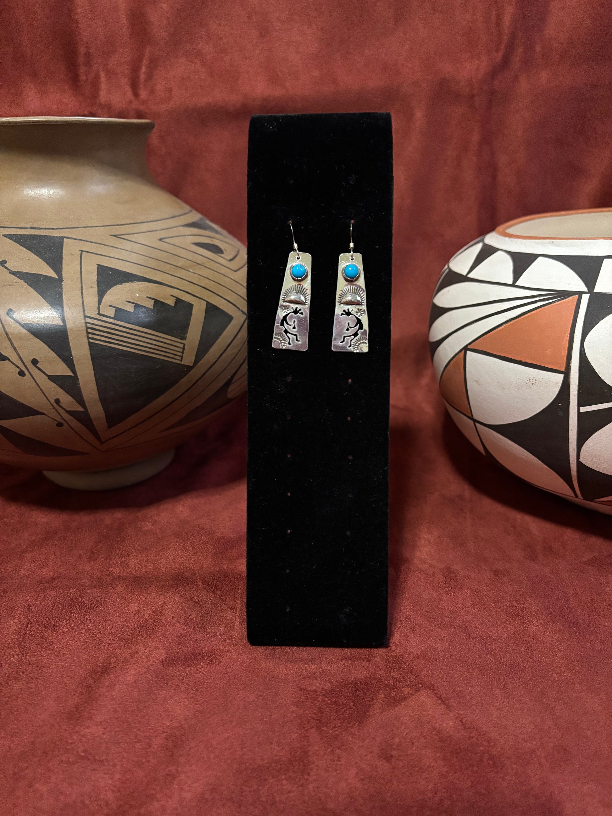 Celebrate Native artistry and spirit with these stunning handcrafted Kokopelli earrings by Navajo silversmith Jeff James. Made from genuine sterling silver, each earring features a beautifully detailed stamped Kokopelli design — the iconic symbol of music, fertility, and joy — accented by a vibrant turquoise stone set near the top.