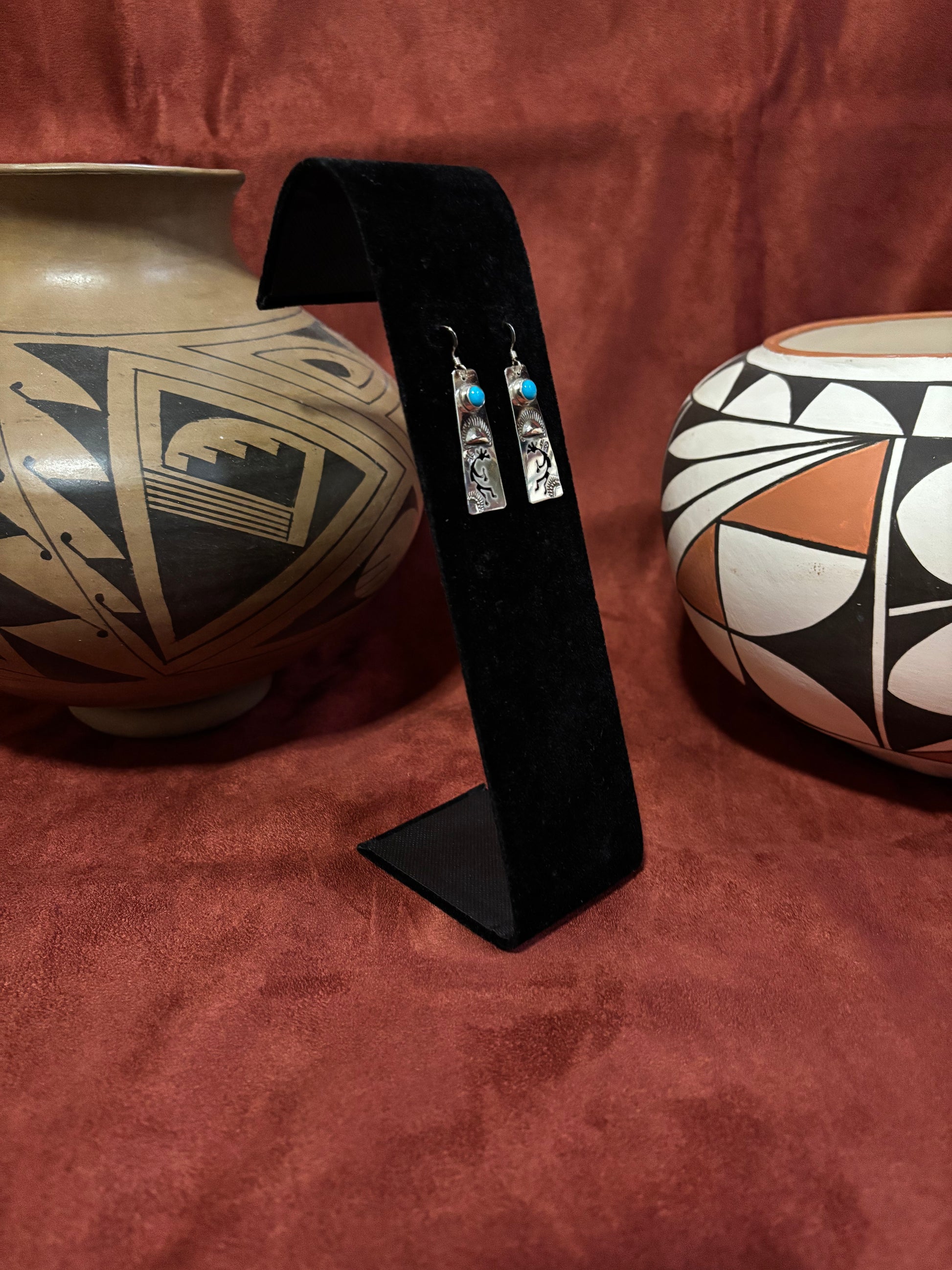 These earrings capture the essence of Southwestern craftsmanship, combining intricate hand-stamped silverwork with the timeless beauty of turquoise. Lightweight and comfortable, they’re perfect for adding a touch of authentic Native American heritage to your look.