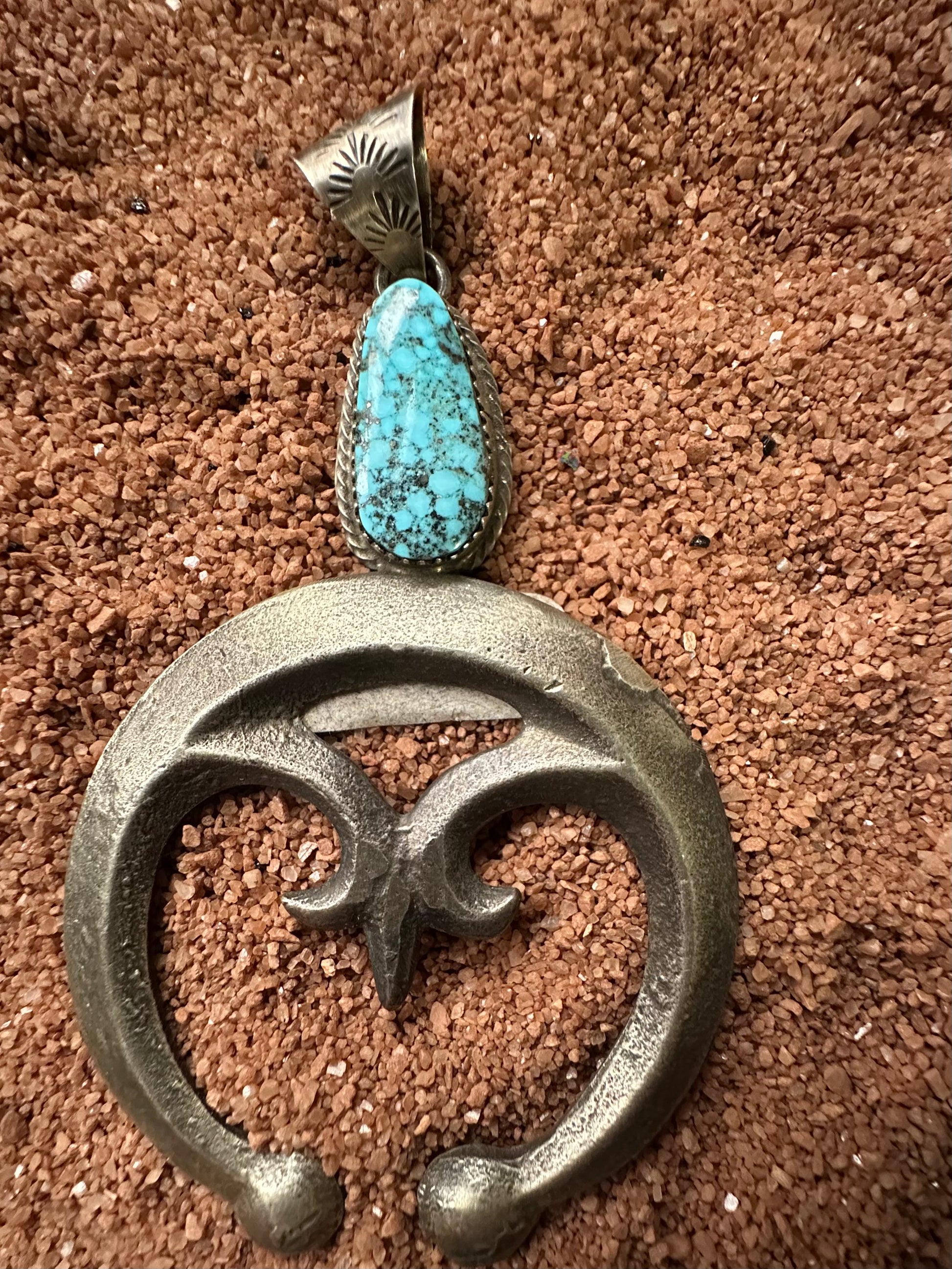 A striking large-scale naja pendant showcasing an exceptional Blue Gem Birdseye turquoise stone. This powerful crescent form is crafted in heavy sterling silver with fine rope bezel and dangle detail—rooted in Navajo silversmithing tradition, by Tonya Yazzie.