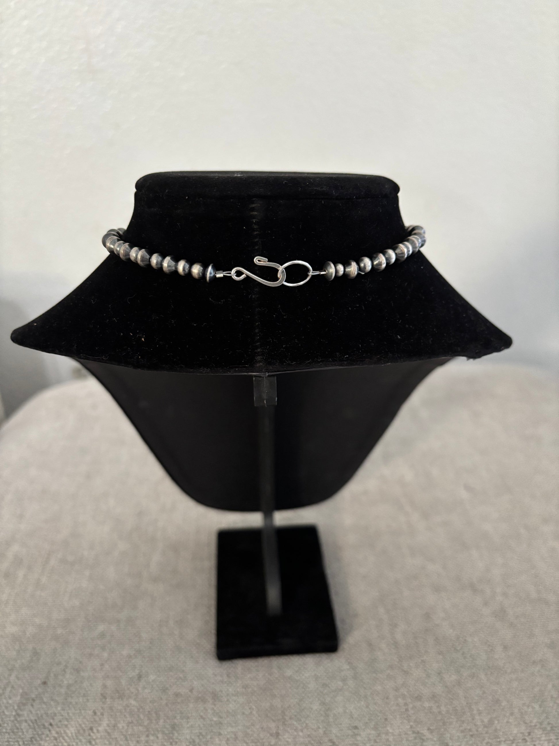 Make a bold statement with this handcrafted 13-inch Mustang silver choker, beautifully graduated for a striking, elegant profile. This piece features a rich combination of bead styles, including 6–10 mm saucers, 8 & 10 mm fluted pumpkin beads, and 3–6 mm rounds—each adding depth, texture, and classic Southwestern character.