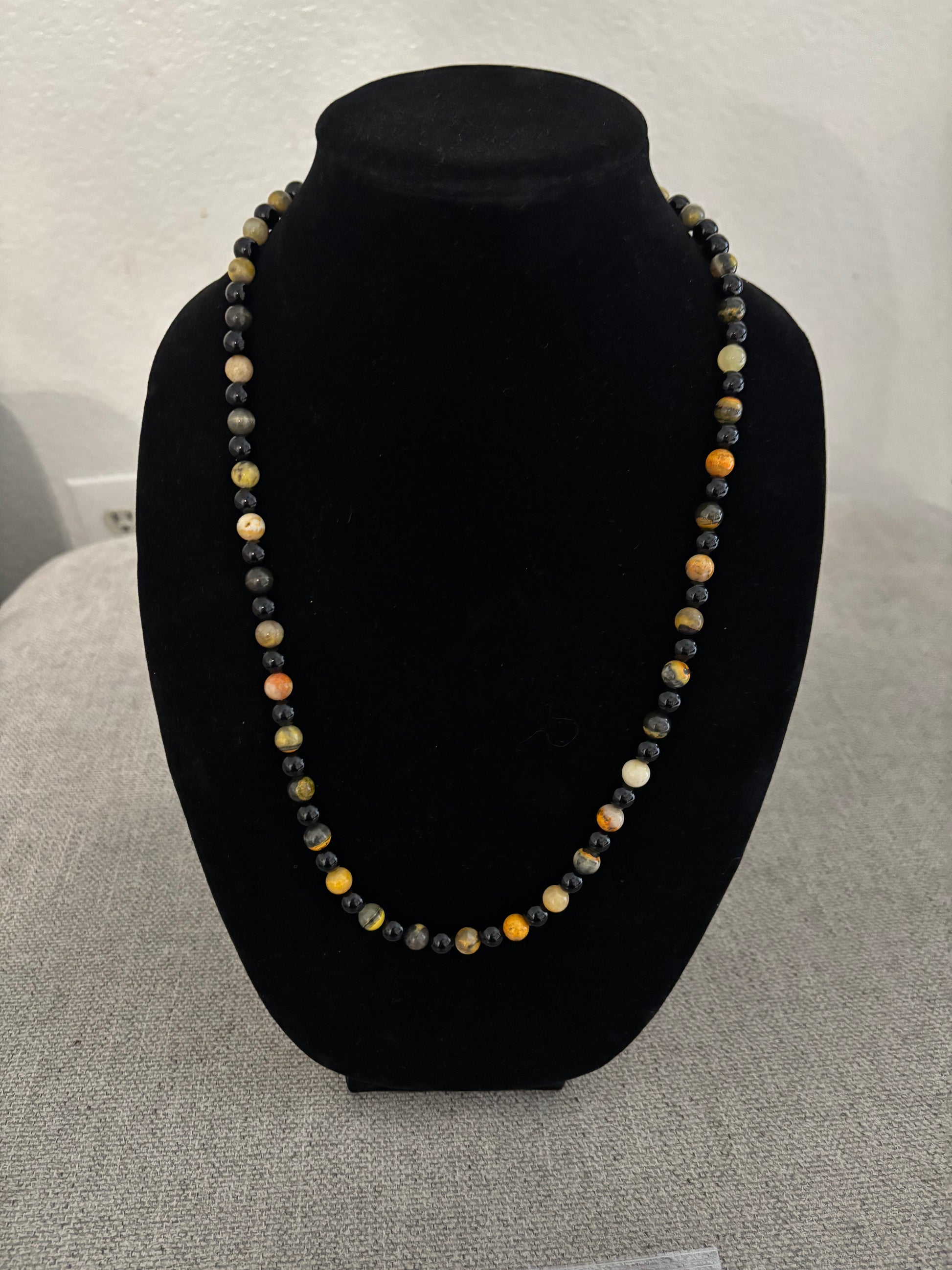 Make a bold statement with this striking 24-inch beaded necklace featuring 8mm round Bumblebee Jasper paired with polished Black Onyx. The vivid golden-yellow patterns of Bumblebee Jasper contrast beautifully with the deep, glossy onyx beads, creating a powerful and eye-catching design.