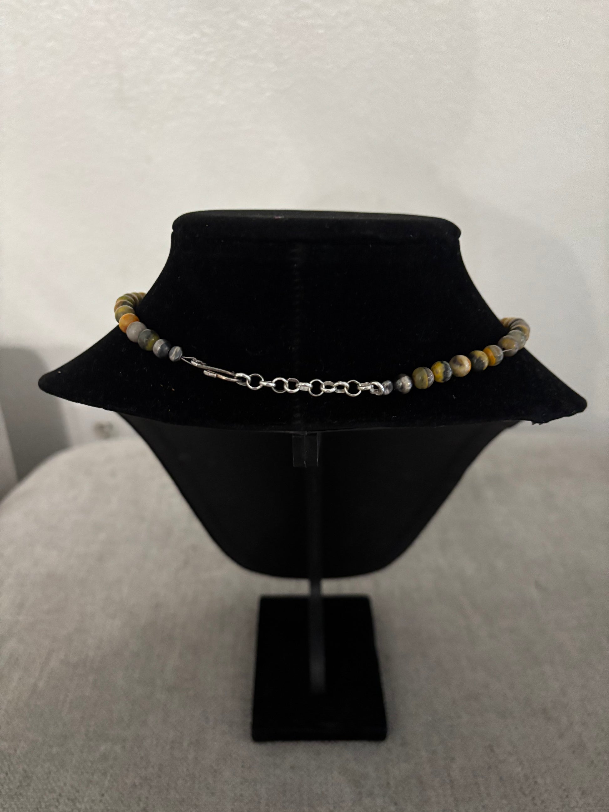 Bright, warm, and full of natural character—this 13-inch Bumblebee Jasper necklace is a compact statement piece perfect for layering or wearing on its own. Crafted with 6mm round Bumblebee Jasper beads, each stone showcases the signature golden, charcoal, and honey-toned swirls that make this gemstone so striking.