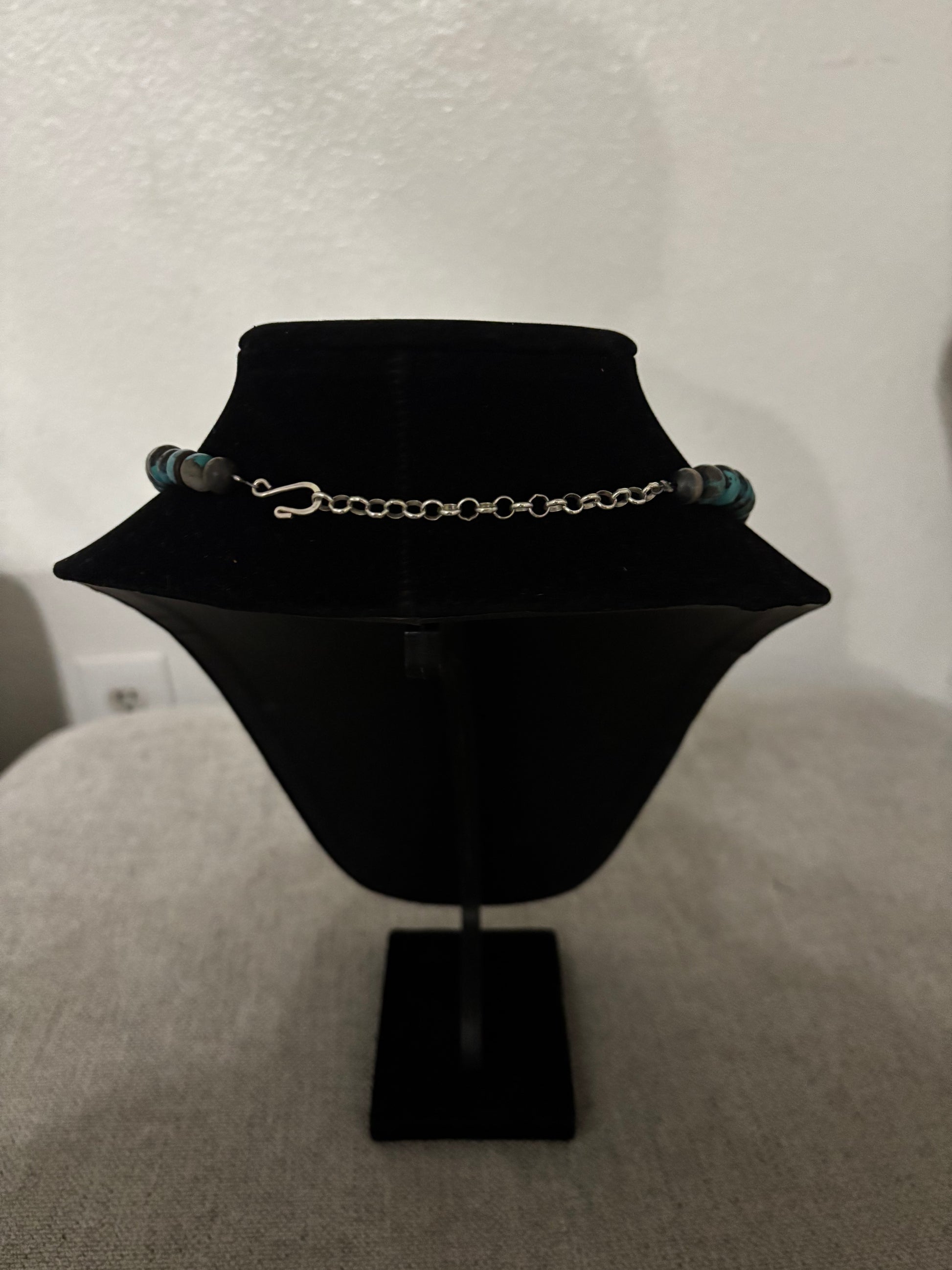 Make a powerful statement with this stunning Cloud Mountain Turquoise necklace, featuring beautifully polished 10mm turquoise barrel beads known for their rich blue tones and natural matrix. The stones are paired with an elegant mix of handcrafted Navajo pearls, including fluted saucers, traditional saucers, and round sterling beads that add depth, shine, and authentic Southwestern character.
