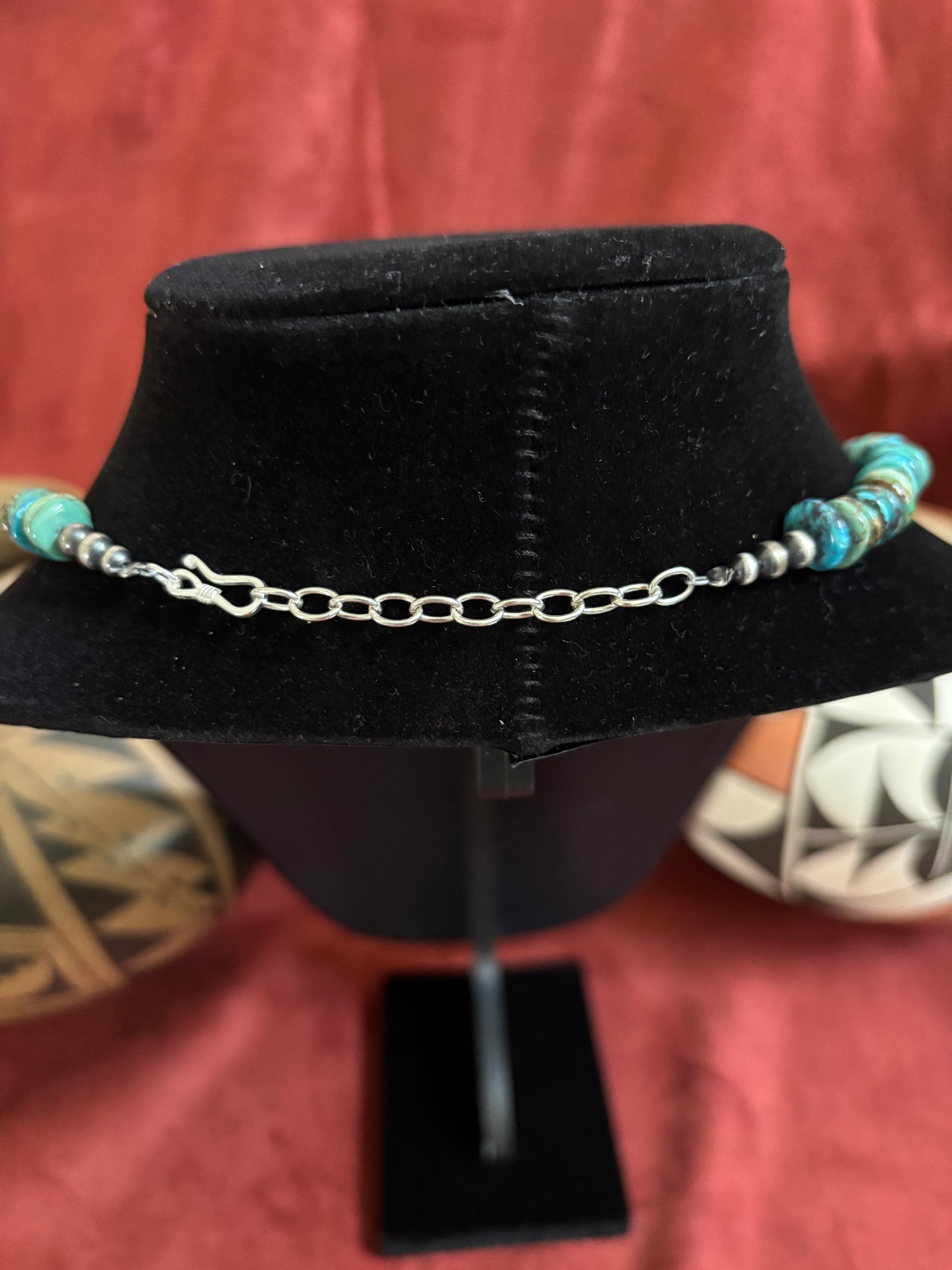 This 16-inch necklace features striking 10mm Green Hubei Turquoise rondelles, beautifully complemented by 4–5mm silver pearl ends. The vivid green tones and natural matrix variations of Hubei turquoise bring an earthy elegance, while the silver pearls add a refined Southwestern finish.