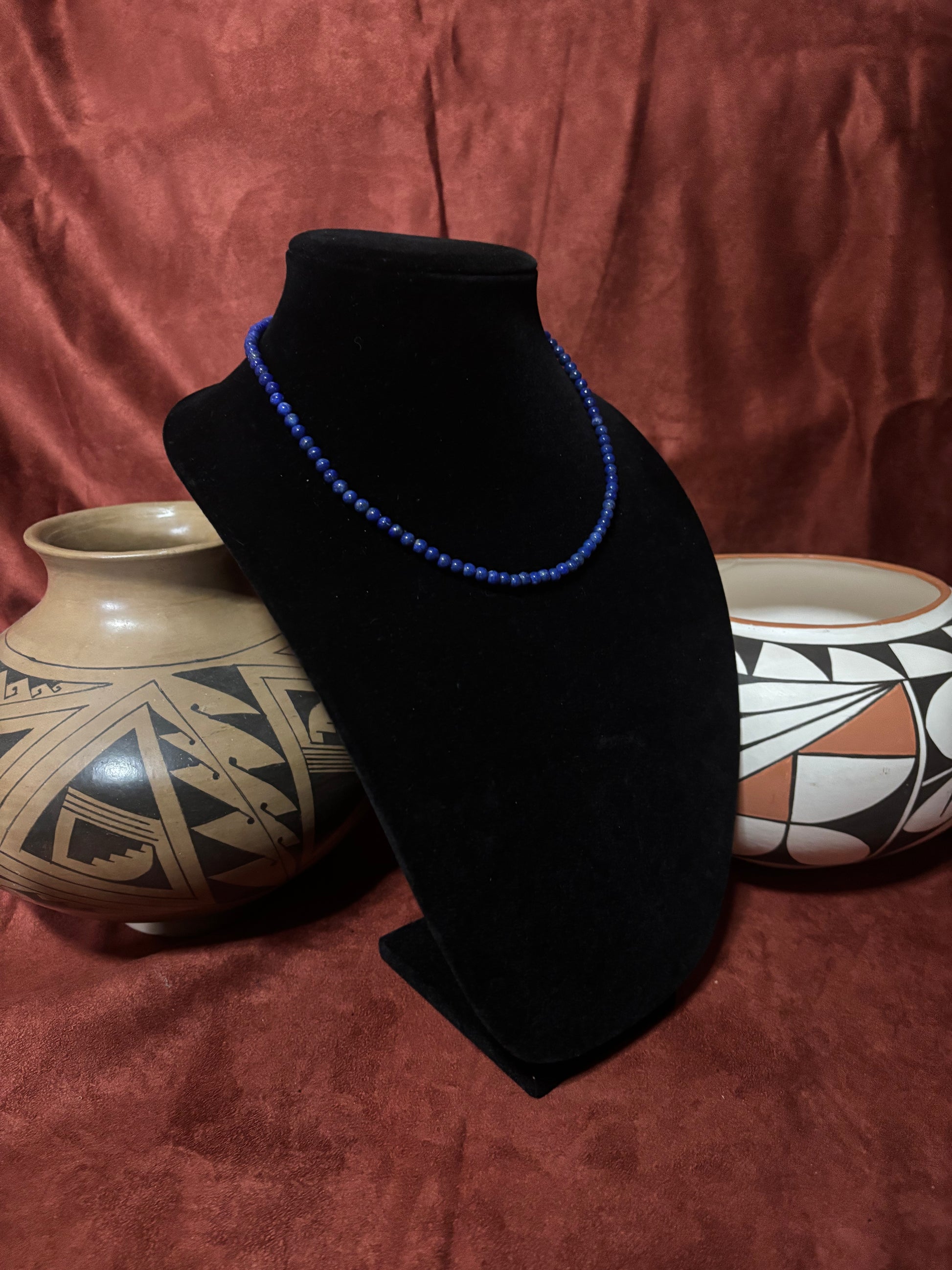 Elevate your style with this 17-inch necklace featuring 6mm premium Lapis Lazuli rounds, prized for their deep royal blue color and natural golden pyrite flecks. The design is beautifully finished with 4mm and 5mm sterling silver pearls at the ends, adding a touch of classic Southwestern elegance.
