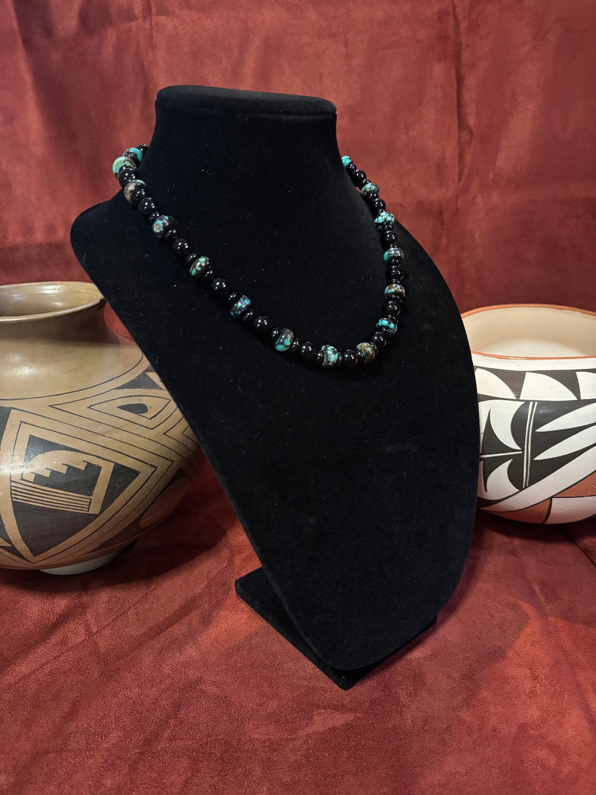 This striking 18-inch necklace features a sophisticated combination of 10mm polished Black Onyx beads paired with 12mm Polychrome Cloud Mountain Turquoise rondelles. The deep, glossy black of the onyx contrasts beautifully with the rich blues and earthy tones of the turquoise, creating a timeless and elegant balance of color and texture.