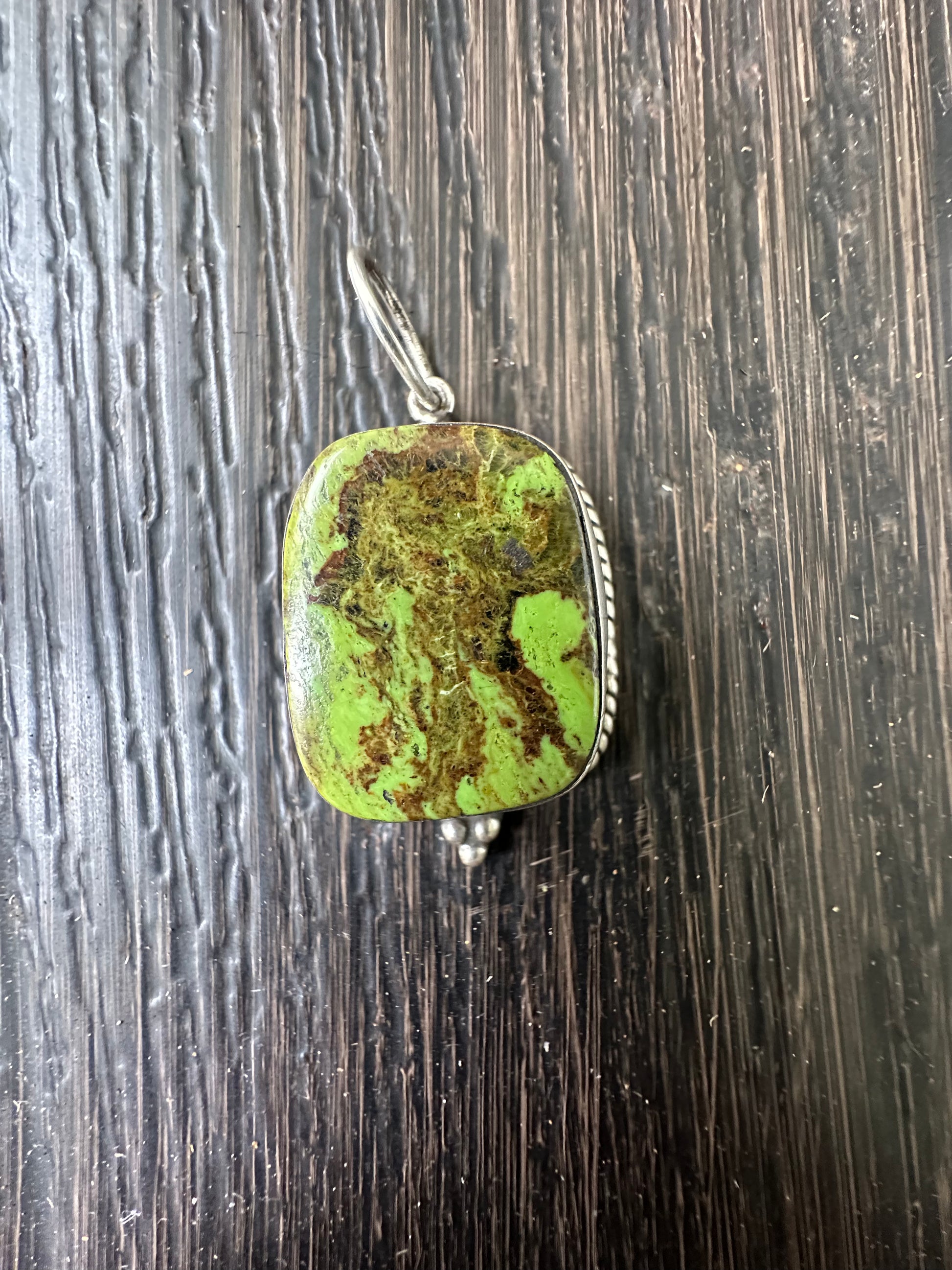 Pendant, Gaspeite, Freeform Rectangle with Silver Filework Bezel
