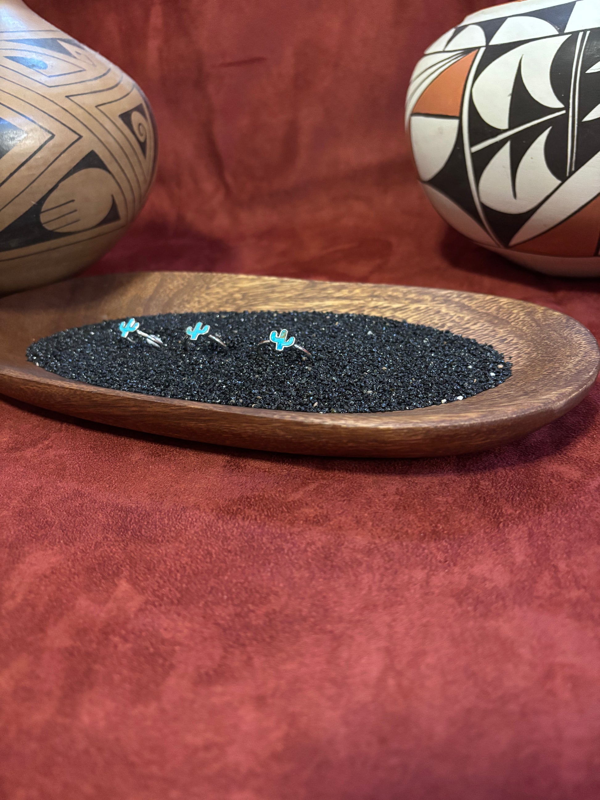 Add a playful touch of desert charm to your look with these turquoise cactus rings. Each ring features a petite cactus design inlaid with vibrant turquoise, set in sterling silver for a clean and polished finish.