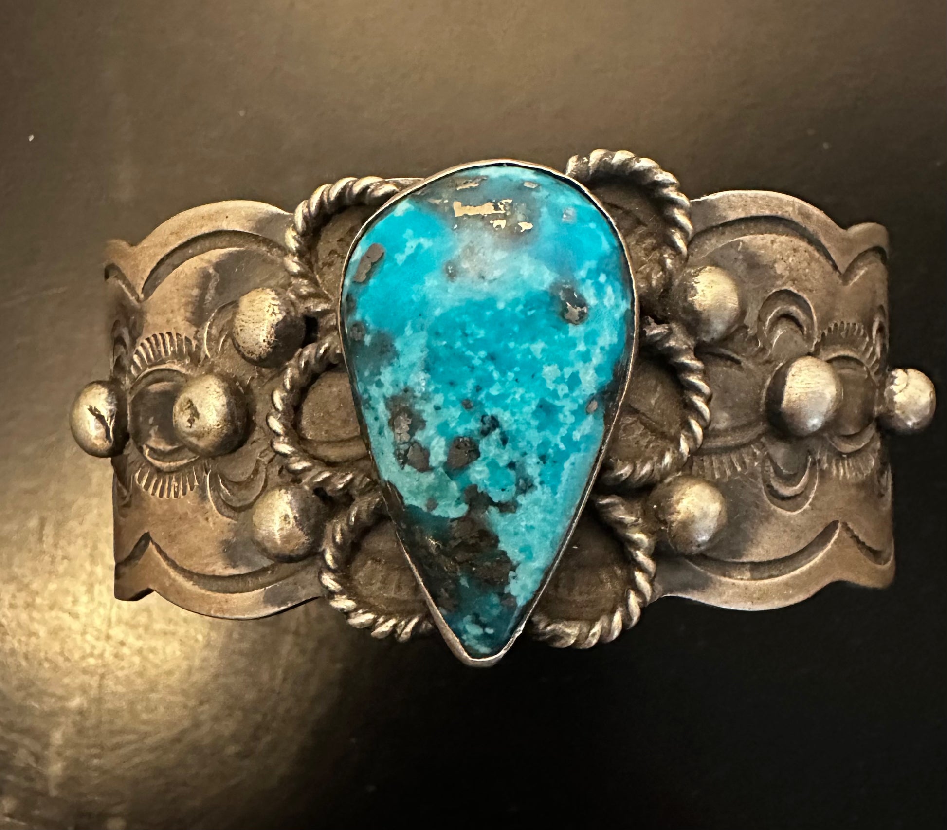 This striking cuff bracelet showcases a luminous teardrop-cut Sonoran Gold stone, an Arizona turquoise prized for its warm golden hues and natural matrix patterns. Handcrafted by Chimney Butte, the piece features meticulous stone setting that highlights the gem's distinctive coloring and organic character. The cuff's open design allows for comfortable adjustment to fit various wrist sizes. Sonoran Gold's unique composition makes each stone one-of-a-kind, ensuring your bracelet is truly individual. An exceptional choice for collectors and those seeking authentic Native American artisan jewelry.