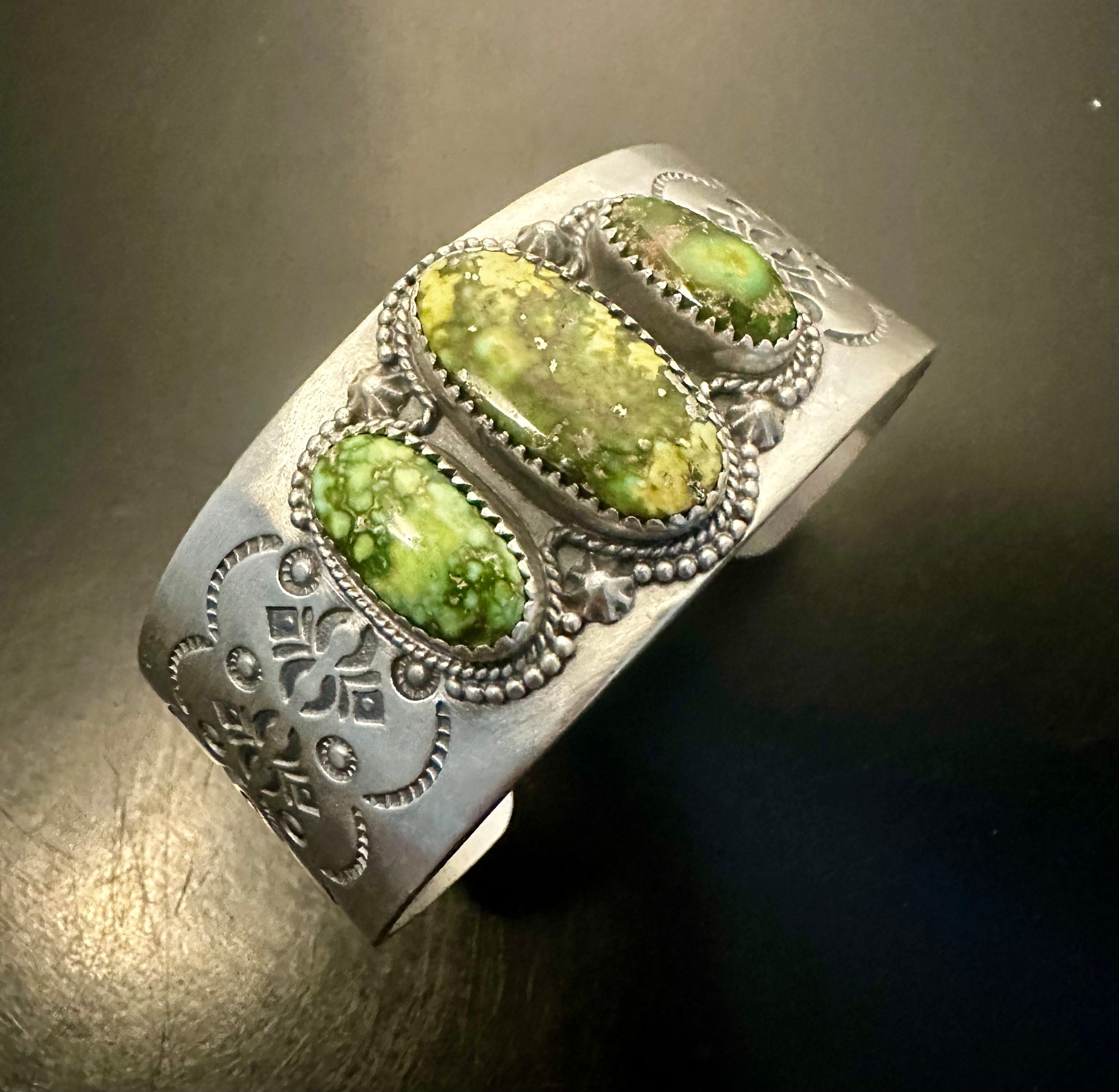 This sophisticated cuff bracelet showcases three oval-cut palomino stones, distinguished by their serene green coloration and natural luminosity. Palomino stone's subtle variations in tone create visual interest while maintaining an understated elegance. The oval faceting amplifies the stone's inherent glow, revealing the depth characteristic of quality gemstones. Designed for the discerning wearer, this cuff offers versatility across occasions—equally at home in professional settings or paired with evening wear. A timeless investment piece that celebrates the quiet beauty of authentic stone craftsmanship.