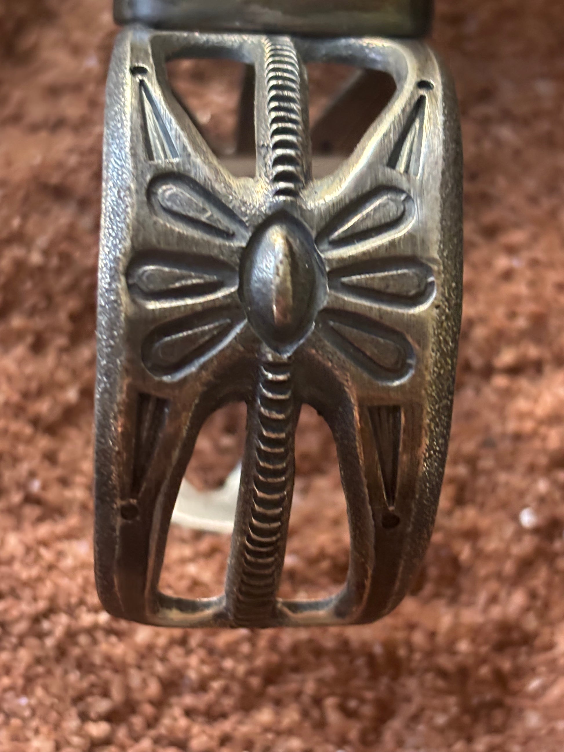 This striking cuff by Robert Deutsawwe (Zuni) showcases an oval Royal Royston turquoise stone with a vivid blue body and hints chalk and black chert—set in richly textured tufa cast sterling silver. Subtle stampwork accents enhance the organic surface, balancing bold color with handcrafted depth. A timeless piece with powerful presence.