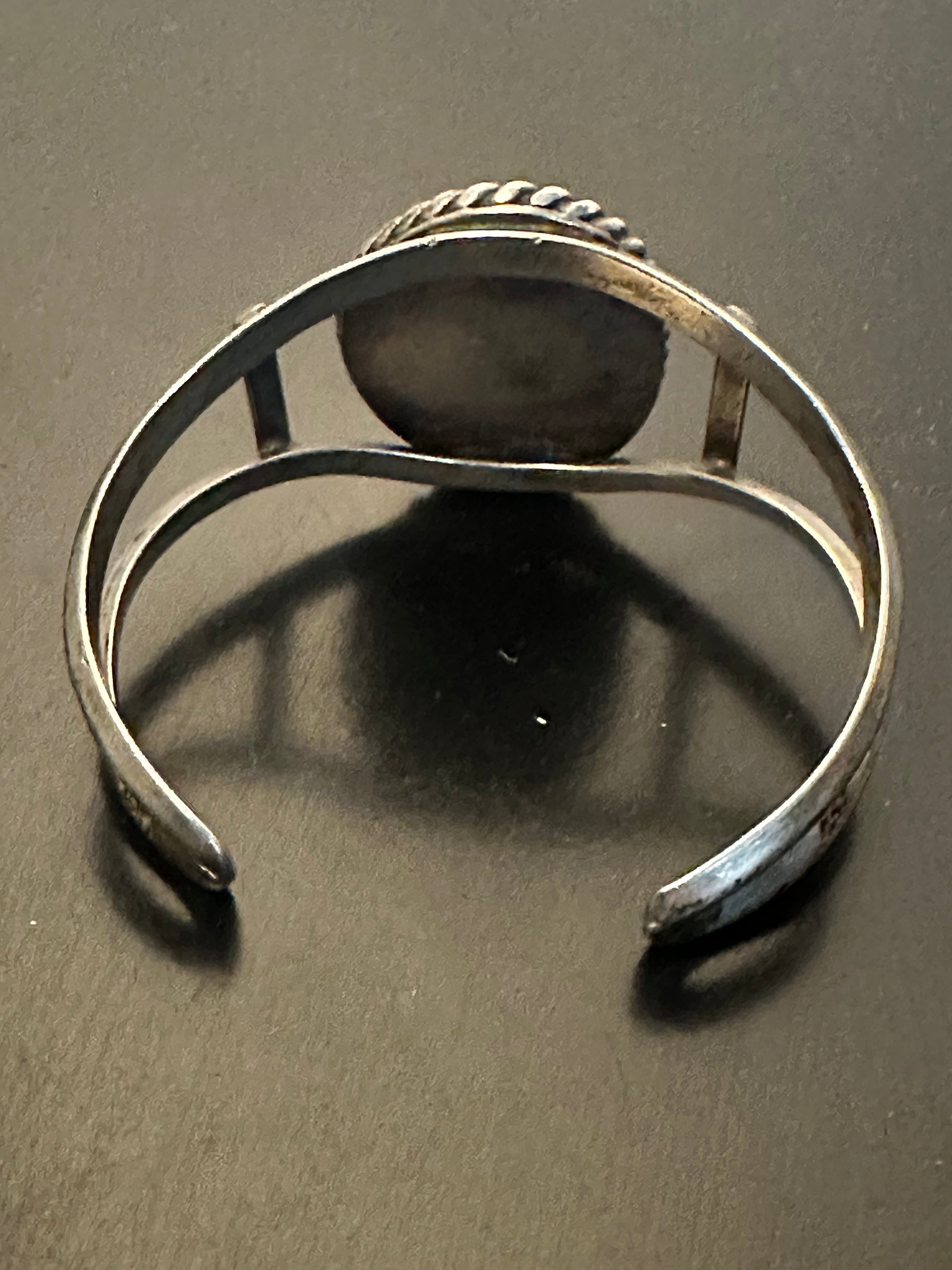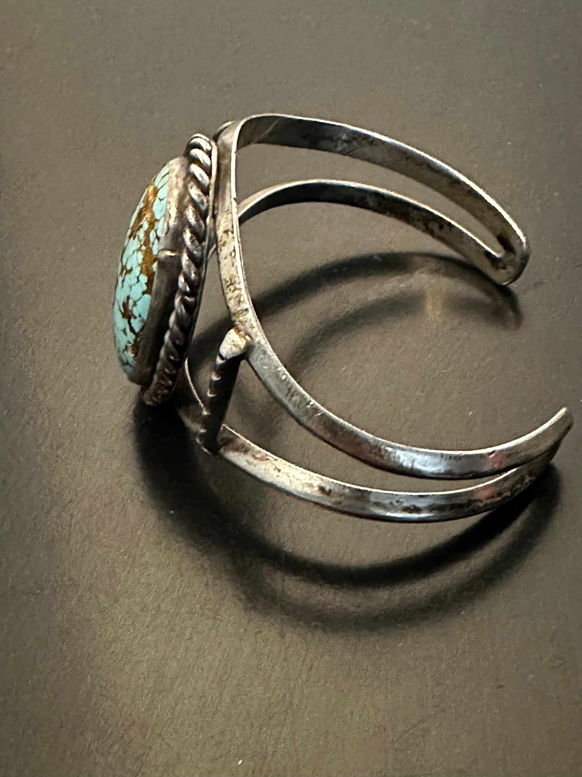 Handcrafted with authentic #8 turquoise, this vintage two-wire cuff showcases the natural beauty of premium stone work. The dual-wire construction provides both structural integrity and refined aesthetic appeal, allowing the turquoise's distinctive veining and color variations to take center stage. Perfect for collectors and enthusiasts who appreciate traditional silversmithing techniques and genuine gemstone craftsmanship. A timeless piece that bridges classic design with wearable artistry.