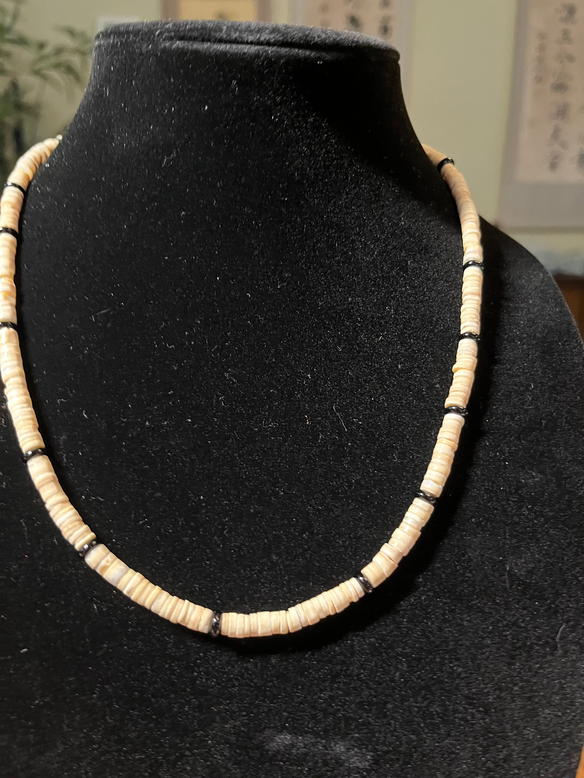 Crafted with natural white heishi beads and accented by 17 polished black onyx rondelles, this 20-inch necklace is a bold and timeless piece. A subtle nod to traditional materials with a clean, modern profile, it's also finished with a secure, high-quality clasp for daily wear.