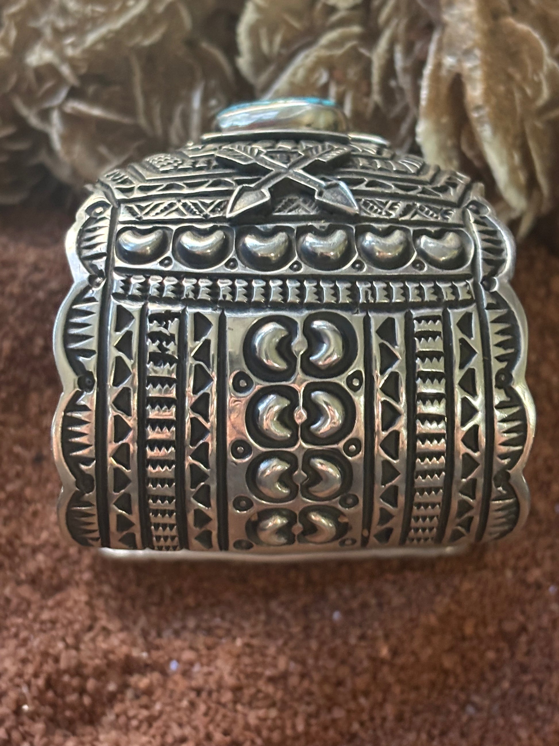 This bold design is technically and artistically breathtaking. The striking stamp work, thunderbird overlay, and high grade spider web stone come together to create a unique and timeless piece of jewelry.